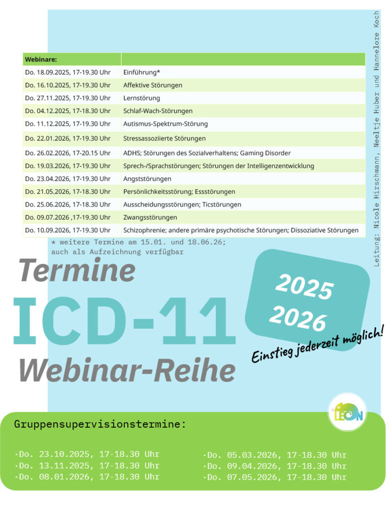 Diese Webinar-Reihe bietet eine umfassende Einführung und Vertiefung in die Diagnostik psychischer Störungen im Kindes- und Jugendalter nach dem neuen Klassifikationssystem ICD-11 für Klinische Psycholog*innen. Die Webinare fokussieren auf die strukturellen Neuerungen und Unterschiede zur ICD-10 und beleuchtet dabei spezifischen Störungsbilder mit praktischen Fallbeispielen oder vertiefen und diskutieren die neu erworbenen Kenntnisse mittels Quiz.